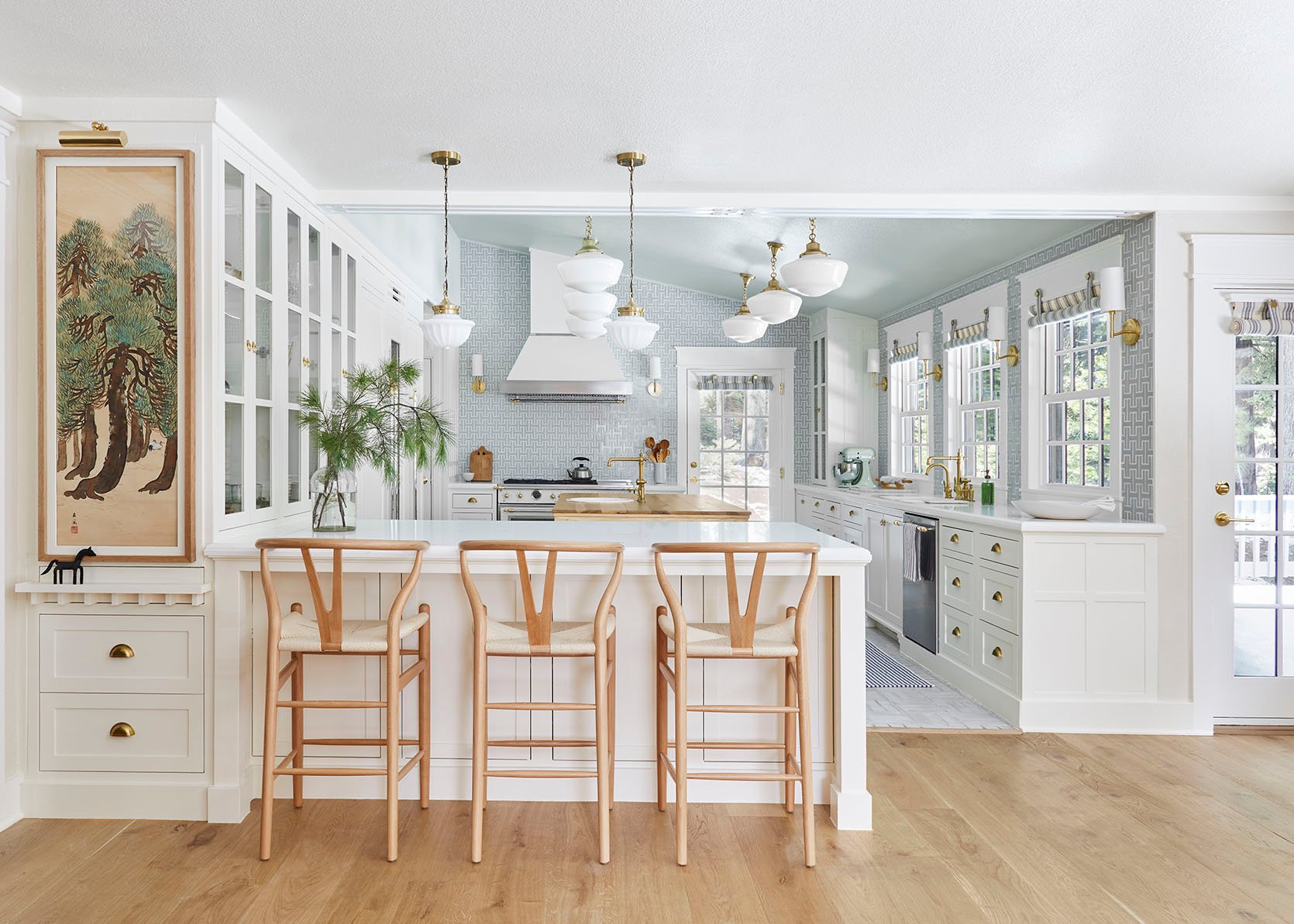 Another one of my favorite details is the beautiful antique painting I installed on the side of the china hutch. I did this because I don’t love looking at the side of a cabinet and wanted to do something intentional to make the spot a focal point rather than an eyesore. I found the art on Etsy and it was definitely a splurge. It cost $500 and that expense came at a time where I was REALLY running out of money for the project. I’ll do a budget breakdown at some point, either here or in my newsletter, but the overall budget for this kitchen was over $200K (I haven’t finished the tally yet), I put in a bit more than $100K, so I am definitely still digging myself out of a financial hole. Why did I spend $500 I didn’t have on art? Because I knew it would totally define the space. Not only was it in my minty color palette, it speaks to the majestic pines outside the windows. I’m still broke from doing this, but I don’t regret buying the painting at all. I built a frame for it out of scrap wood from a wood flooring project, installed it on the side of the cabinet, and added an art light.