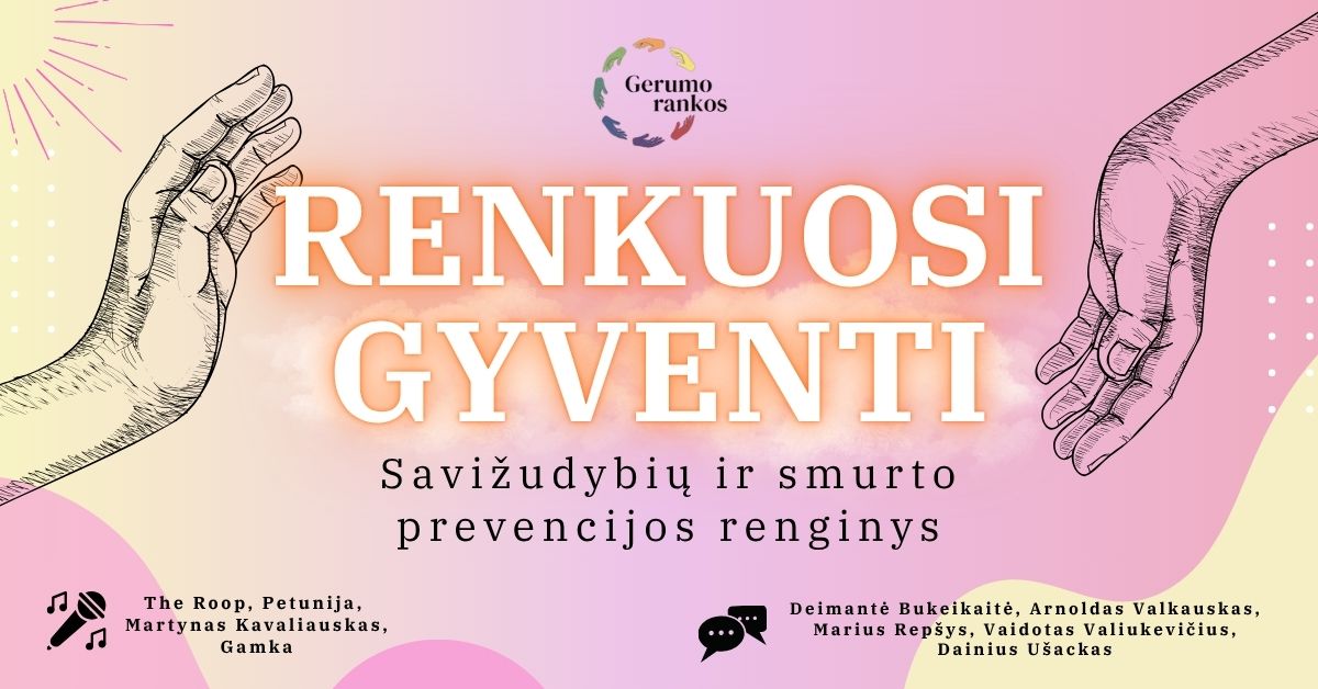 Jei Tau kada kilo tokia mintis, arba su panašiomis mintimis susiduria Tavo rato žmonės – kviečiame Tave Lapkričio 3 d. į Kauno kultūros centre (Vytauto pr. 79) vyksiantį tradicinį, jau šeštus metus VšĮ „Gerumo rankos“ organizuojamą savižudybių ir smurto prevencijos renginį „Renkuosi gyventi“.